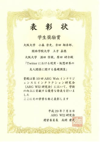 小森 崇史,吉田 翔吾郎,土方 嘉徳,酒田 信親,原田 研介:Twitterにおける現実・仮想世界の友人関係に関する基礎調査,ARG